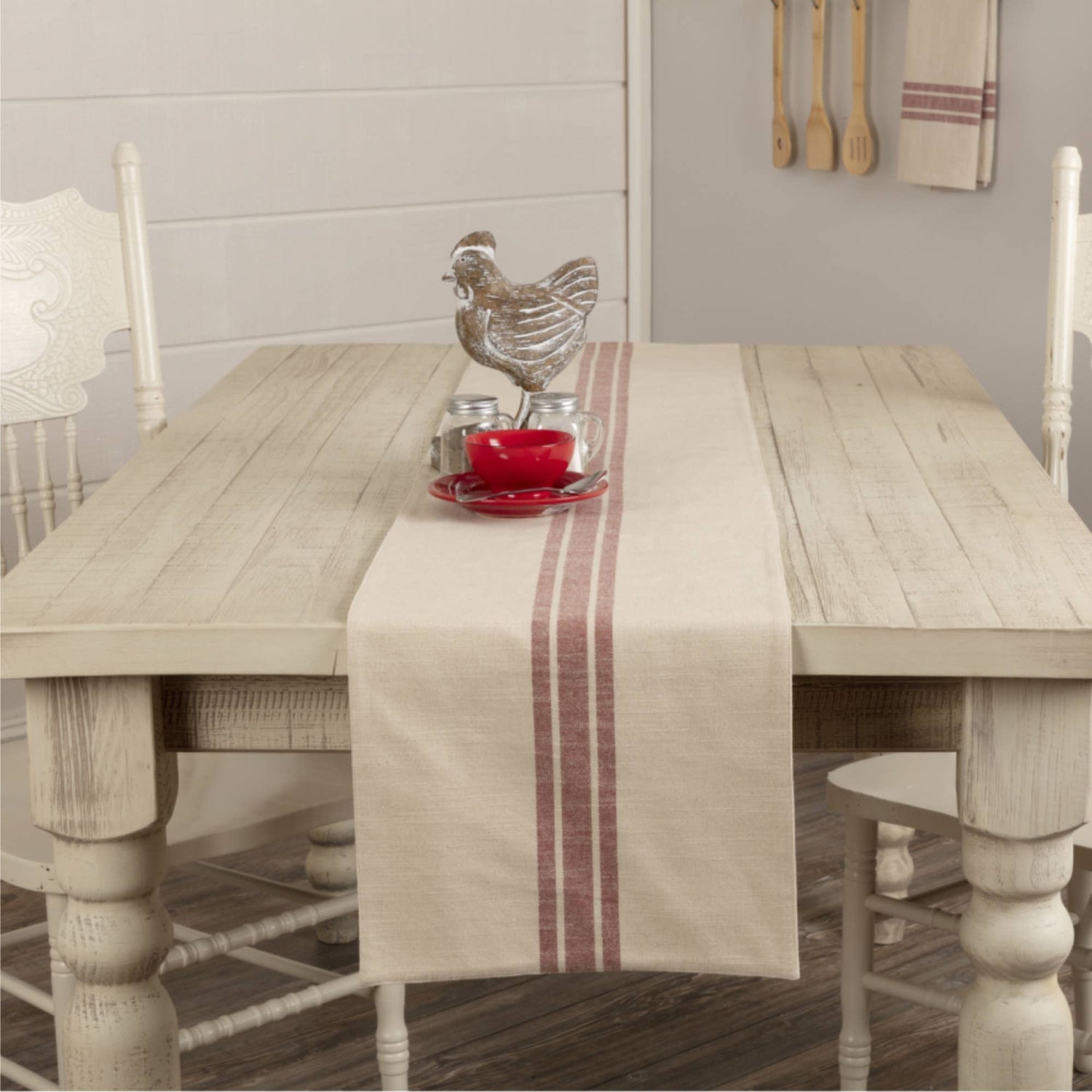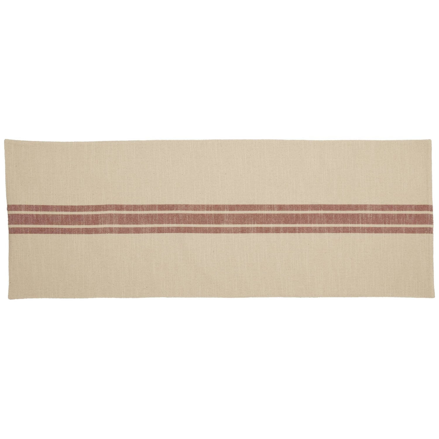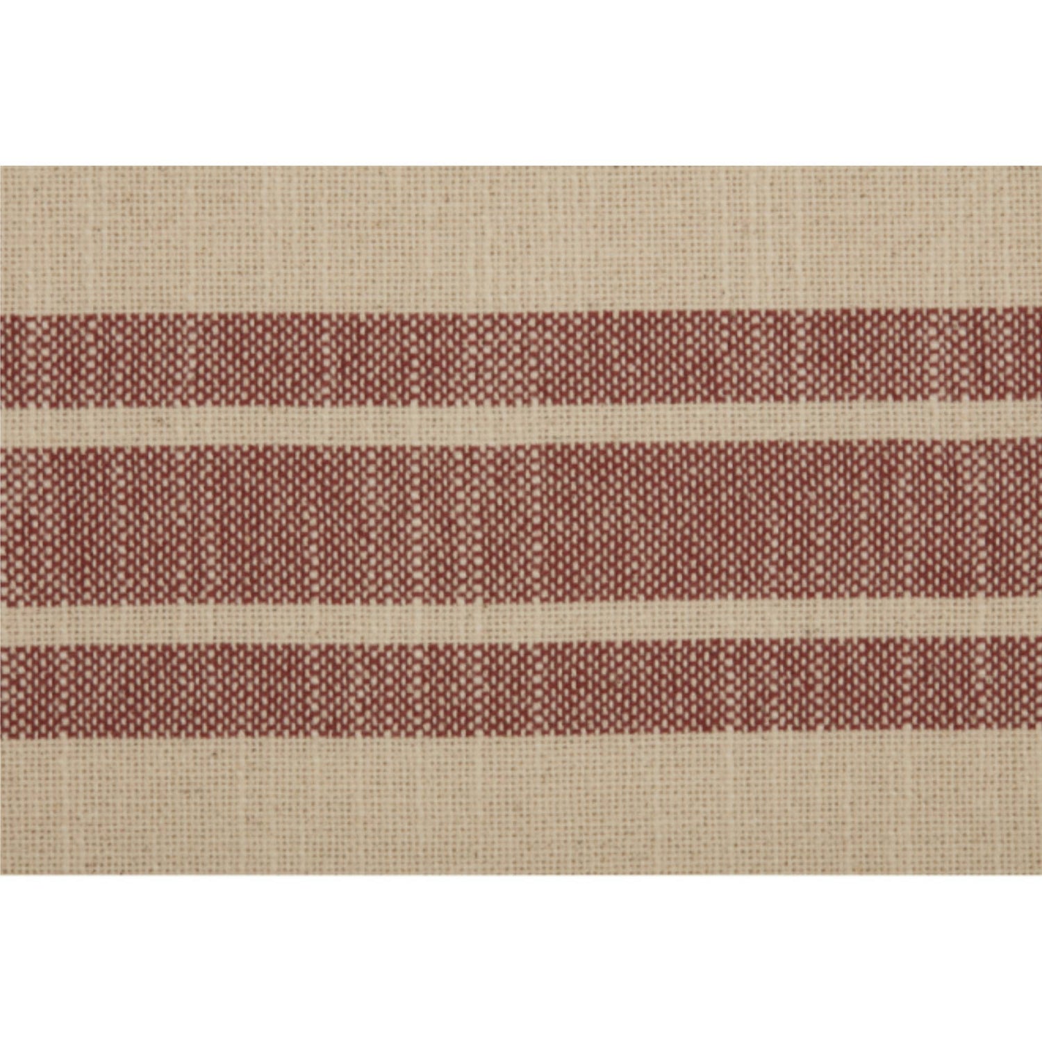 We LOVE stripes and grain sack fabrics and we know that you do too! When we combined grain sack fabric with wide ticking stripes in our Market Place Collection, we created one of our most popular and timeless farmhouse styles. We've been hearing for some time now that many of you would like to see the Market Place in a true farmhouse red. Well, here it is, and we just know you're going to love it! For this collection, we chose a beautifully textured, substantial weight cotton with a surprisingly soft hand feel. One set of broad woven stripes in muted brick red run down the center of the runner, and make a delightful contrast against the natural cream base. The table runner measures 13 x 36 and reverses to a soft cream cotton.